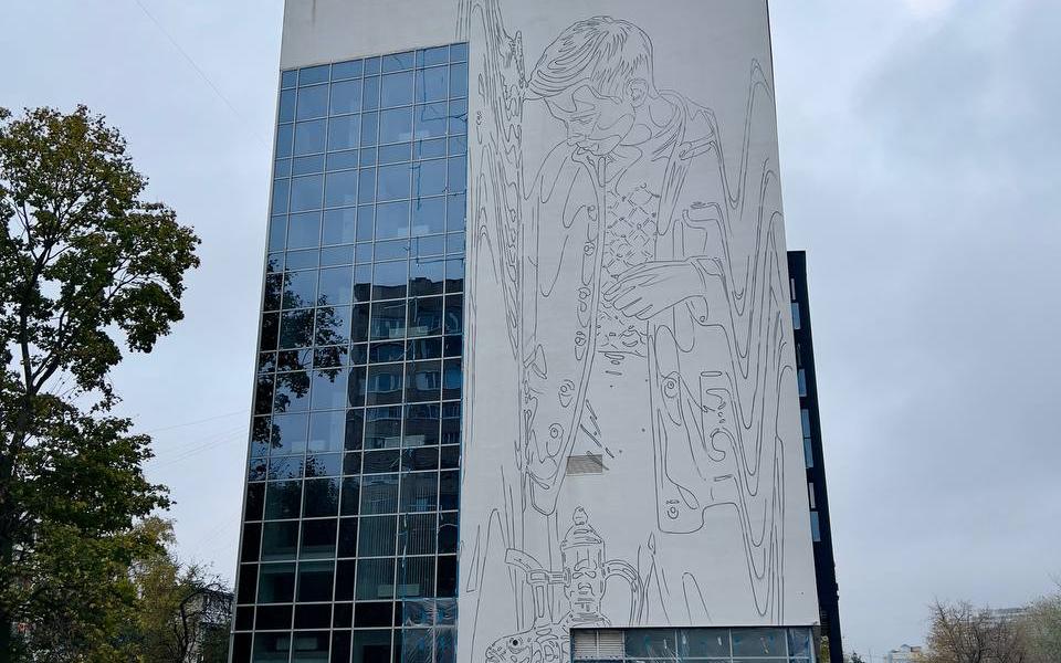 На стене здания бизнес-центра «Квадрум» наметили новый мурал. Фото появилось в телеграм-канале автора работы.