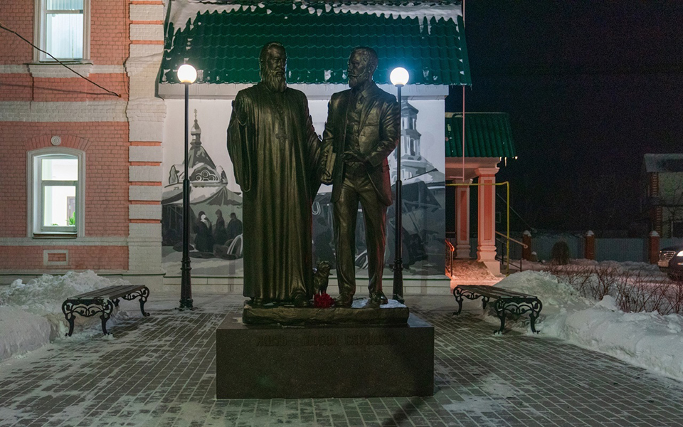 Скульптура посвящена протоиерею Стефану Остроумову и его другу, земскому врачу, Владимиру Павловичу Клевезалю.