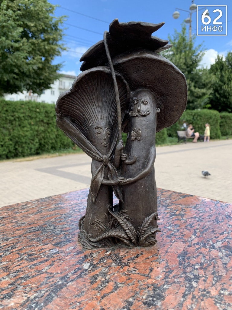 Последняя точка – «Влюблённая пара» на Театральной площади. Фигурка представляет собой два грибочка, ценящих совместные культурные походы. Именно поэтому она расположена напротив Рязанского театра драмы.
