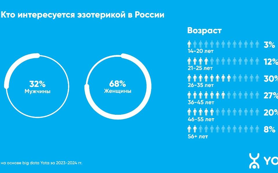 Жители Рязани в 2024 году стали заметно чаще интересоваться эзотерическими практиками. Общее число пользователей, посещающих сайты об астрологии, гаданиях и нумерологии, выросло на 21% по сравнению с прошлым годом, а прирост интернет-трафика таких ресурсов составил 17%. Также увеличилось общее время, которое россияне проводят на эзотерических порталах, — на 19%. К такому выводу пришли аналитики Yota на основе обезличенных данных абонентов за первые 8 месяцев 2023 и 2024 годов.