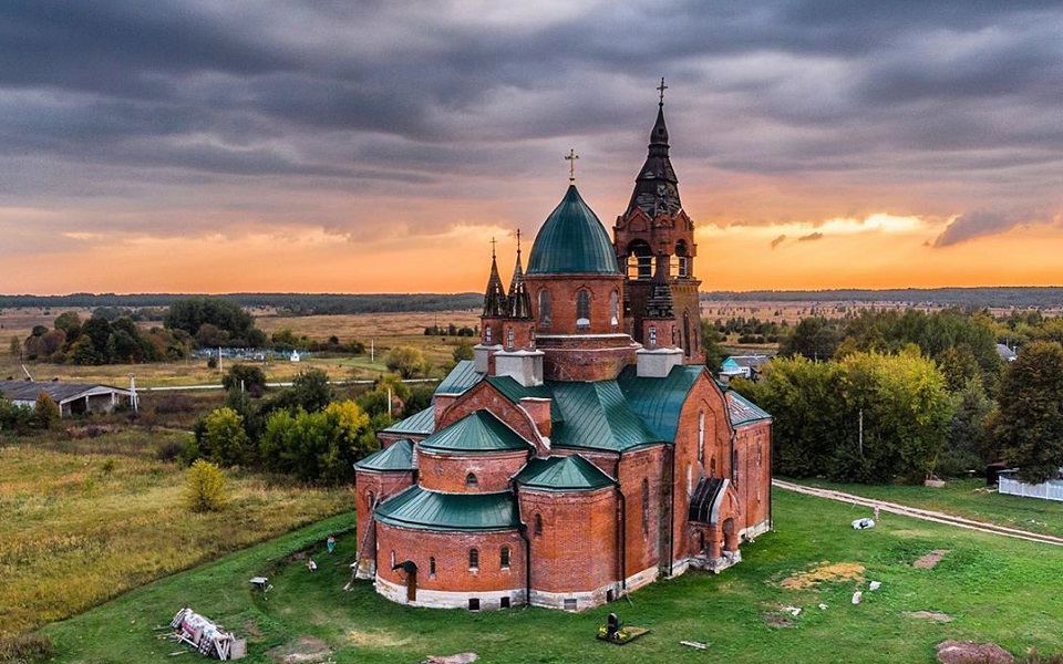 Храм находится в стороне от шумных городов и трасс. Величественная церковь с куполами, напоминающими пламя свечей, стоит на приволье среди лугов и леса. Построена она была в 1913 году, когда Российская Империя праздновала 300-летие Дома Романовых. Говорят, местный богач пообещал к этому событию воздвигнуть церковь, которых прежде не бывало – и слово сдержал.