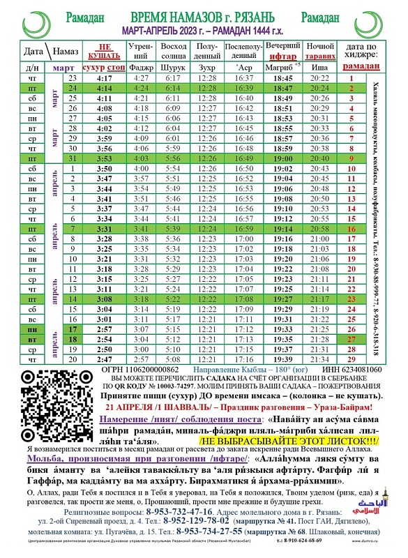 О времени намазов в рамадан рассказал глава мусульман Рязанской области Рашид Бултачеев. Присоединиться к общей молитве можно в молельном доме - в Рязани он расположен в доме №4 по 2-му Сиреневому проезду в Дягилеве.