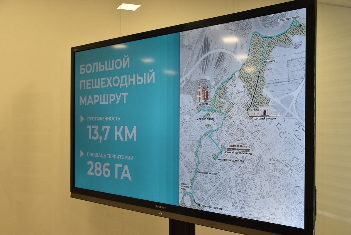 Большой пешеходный маршрут пройдёт по Лесопарку, Торговому городку, Рязанскому кремлю, Лыбедскому бульвару, ЦПКиО. Общая площадь достигнет 286 гектаров. Губернатор попросил Мишустина помочь с реконструкцией Кремлёвского сквера.