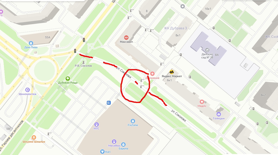 Речь идёт о части дороги по улице Соколова, которая проходит по оформленным земельным участкам по адресам: улица Шереметьевская, дома №6 корпус 1 и №6 корпус 2.