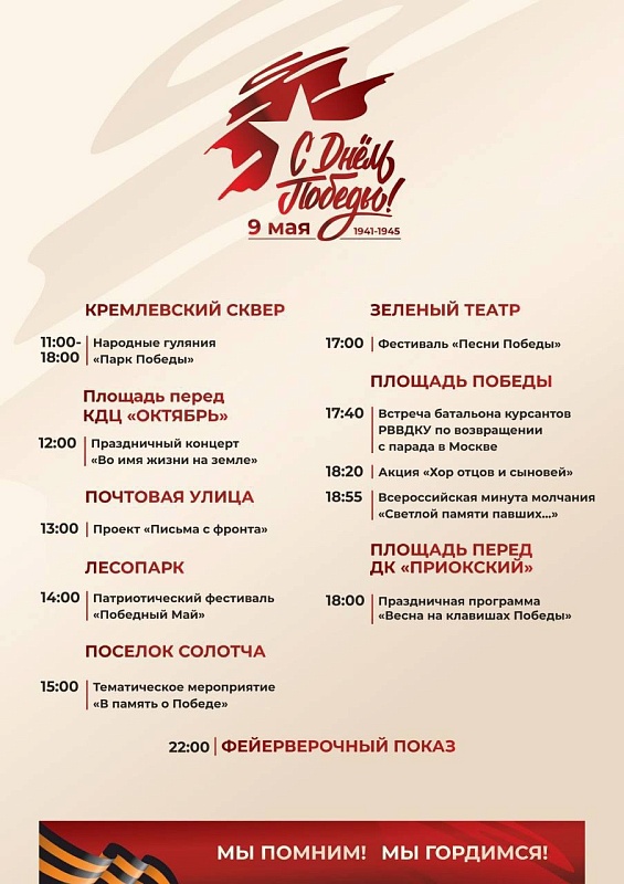 С 15:00 пройдёт тематическое мероприятие в Солотче – «Пусть память сердце говорит». Завершится праздник фейерверочным показом. Начало в 22:00.