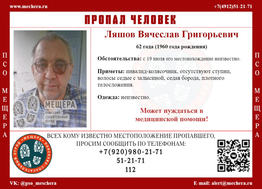 Местонахождение Ляшова Вячеслава Григорьевича неизвестно с 19 июля.