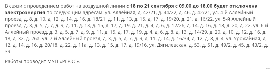 Ограничения связаны с работами на воздушной линии. Так, с 9:00 до 18:00 ресурса не будет по адресам, указанным в закреплённой ниже фотографии.