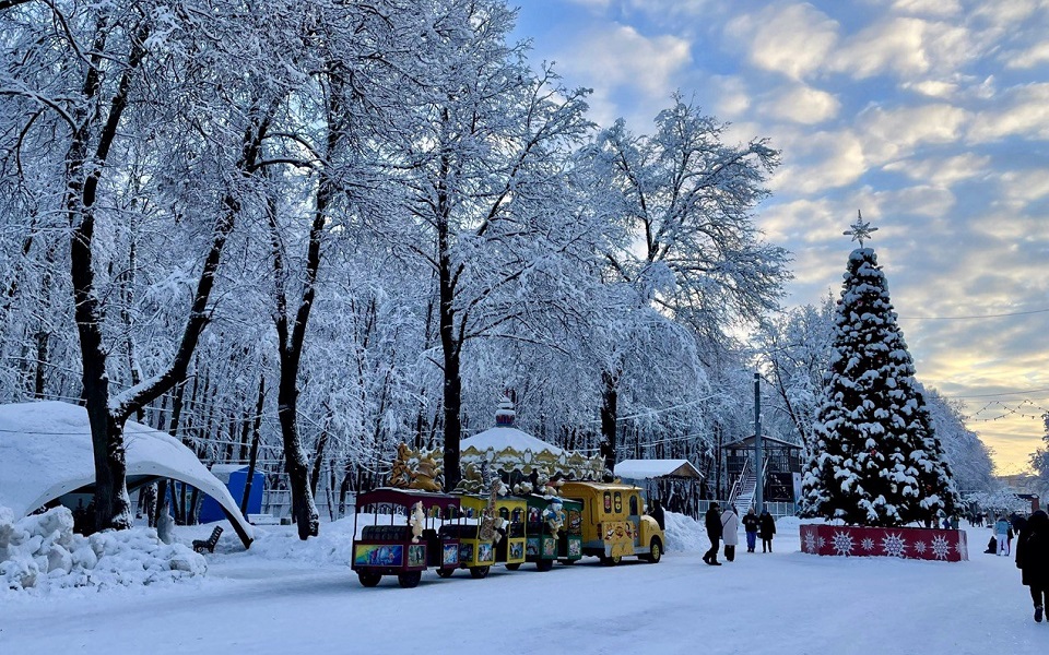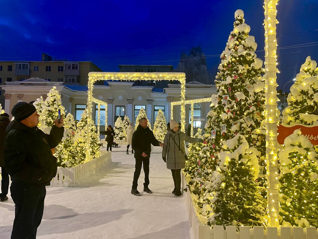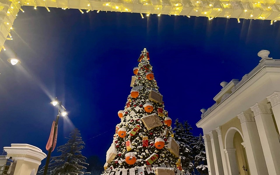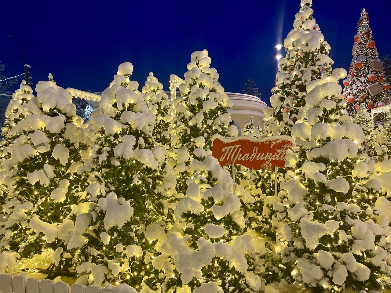 Лесопарк напоминает сейчас новогоднюю открытку - заснеженные деревья, золотые шары на ветках, нарядная елка. В Торговом городке - атмосфера ретро, вид тоже напоминает открытки времен СССР. Эта площадка впервые за долгое время открывает новогодний сезон, и дебют получился по-настоящему ярким.