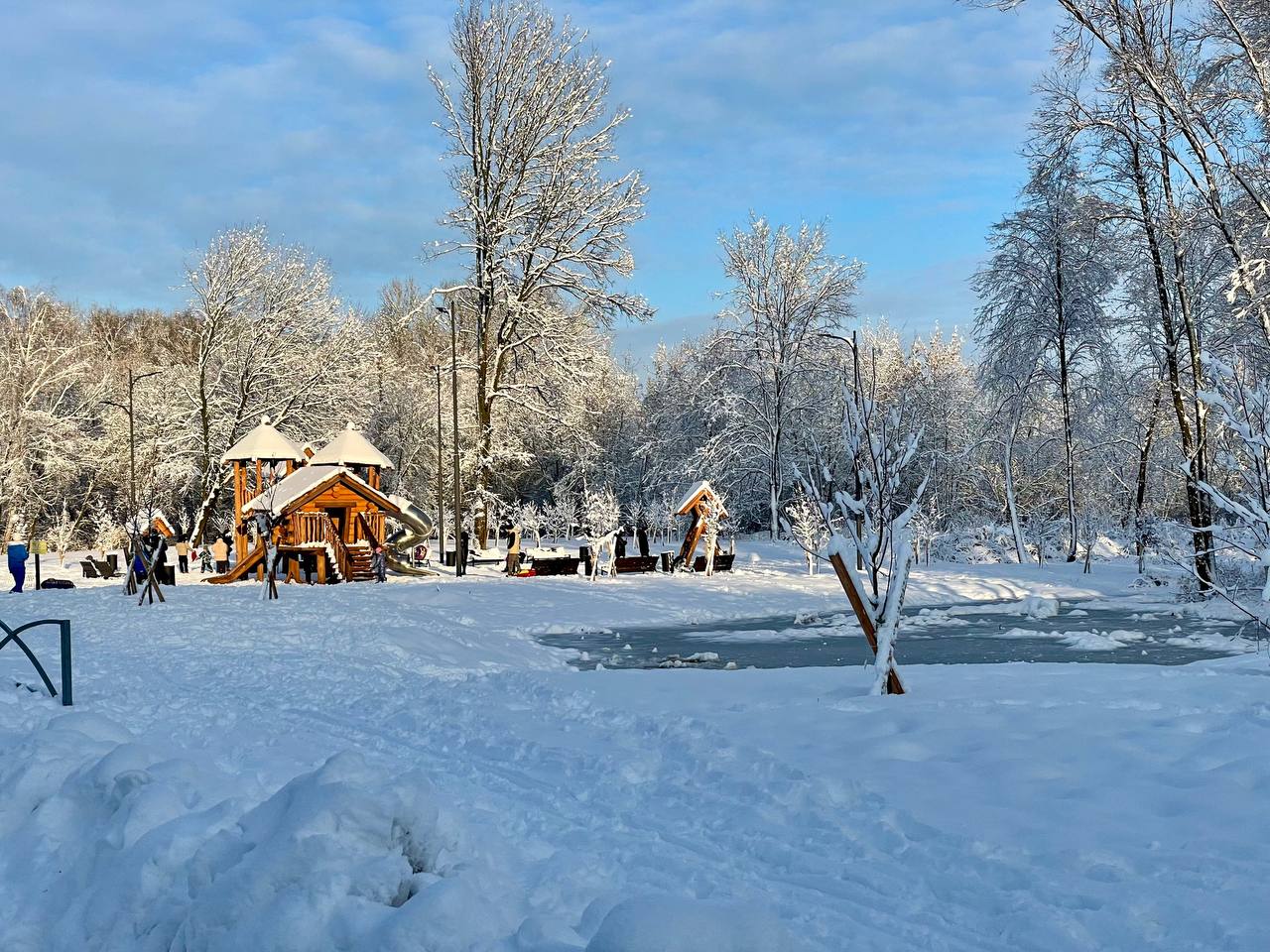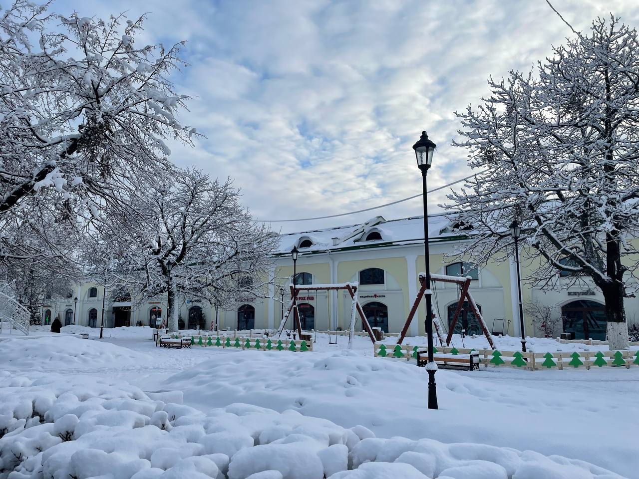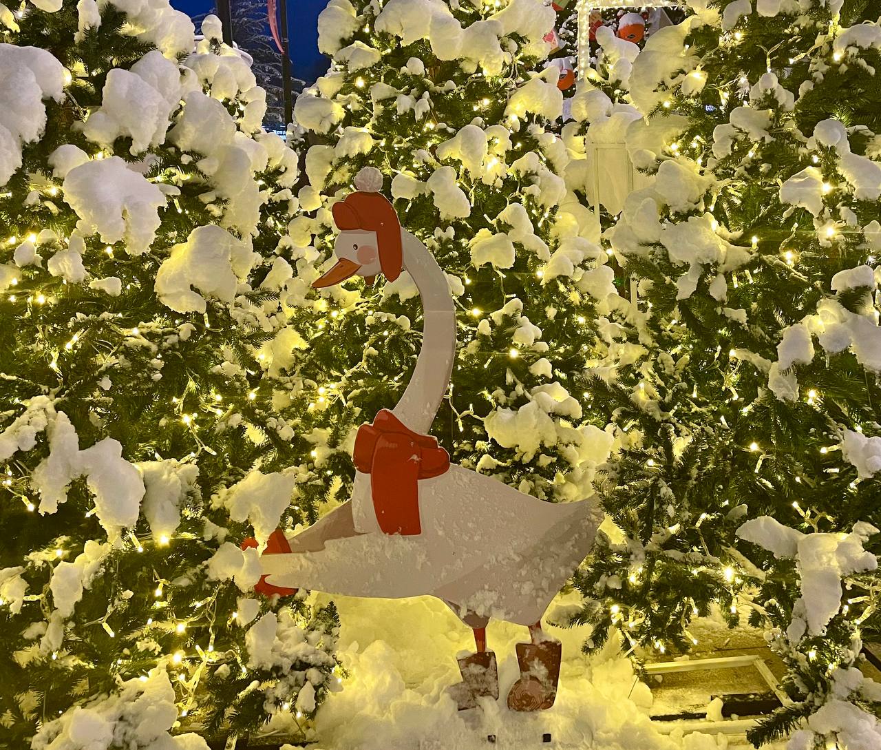 Лесопарк напоминает сейчас новогоднюю открытку - заснеженные деревья, золотые шары на ветках, нарядная елка. В Торговом городке - атмосфера ретро, вид тоже напоминает открытки времен СССР. Эта площадка впервые за долгое время открывает новогодний сезон, и дебют получился по-настоящему ярким.