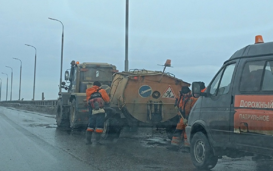 Видимо, зима с перепадами температур становится особым испытанием для дорожного покрытия. В прошлый раз ремонта хватило на неделю, а спустя еще несколько дней у дорожников вновь нашлась на мосту работа.