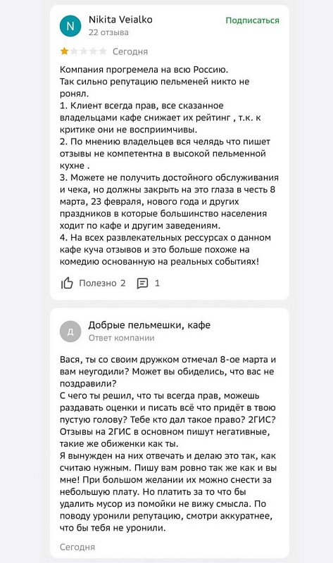 Речь идёт о заведении «Добрые пельмешки», расположенном на улице Грибоедова. В комментариях развернулась настоящая битва: владелец кафе, судя по всему, не переносит критику.