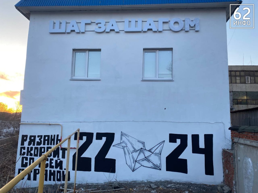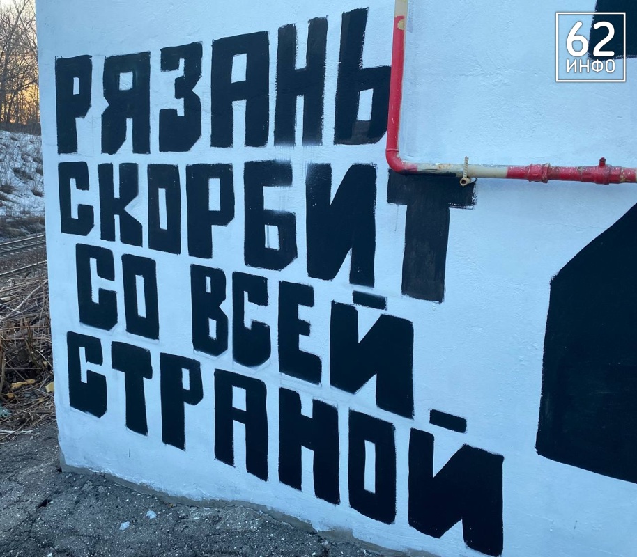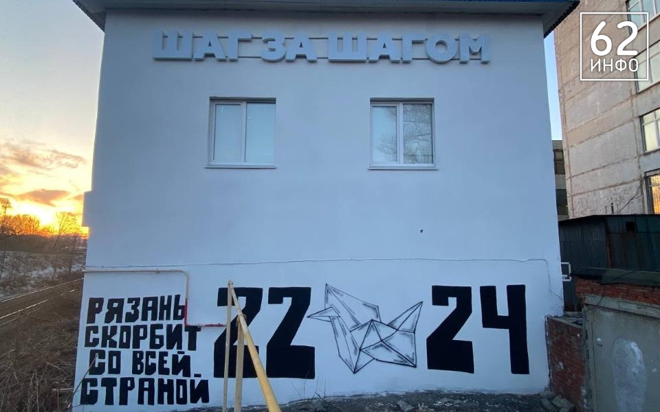 На граффити нанесена надпись «Рязань скорбит со всей страной», а год 2024 разделён журавлём, будто сложенным из бумаги.