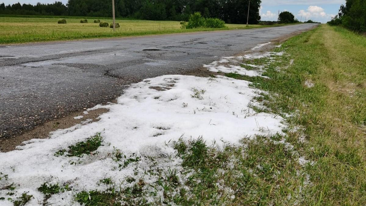 Осадки выпали 26 июня между селом Новоселки и деревней Савино. Очевидец Сергей рассказал, что град был виден издалека. Казалось, что с неба спускается вертикальная белая полоса.