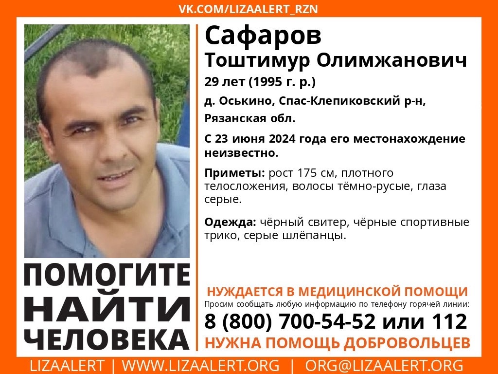 29-летний Тоштимур Сафаров пропал без вести в Рязанской области. Об этом сообщили волонтёры ПСО «ЛизаАлерт».