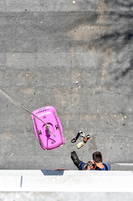 Добровольцы закрепили снаряжение за пожарную лестницу, спустились до уровня второго этажа и спасли кошку.