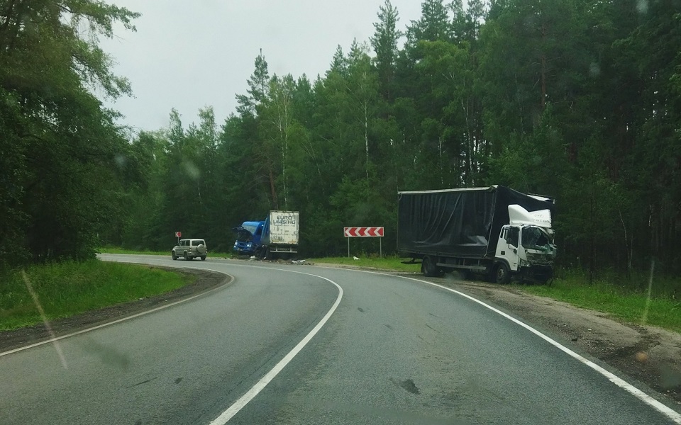 Судя по фото с места ЧП, с дороги вылетели два грузовика. На месте аварии работали полицейские. Соцсети пишут, что есть пострадавший.