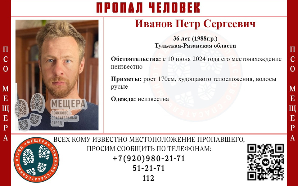 ПСО «Мещера» в своей группе ВКонтакте опубликовал ориентировку на 36-летнего Иванова Петра Сергеевича. Местонахождение мужчины неизвестно с 10 июня 2024 года.