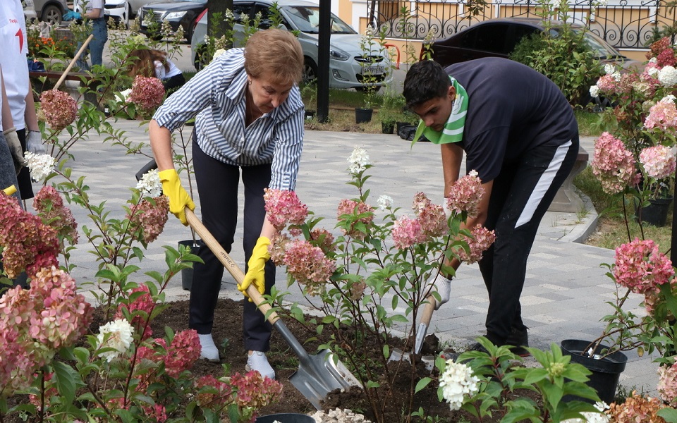 Сквер украсят яблони, кроме того, здесь теперь будут расти около десяти видов декоративных кустарников - туя, спирея, кизильник. Летом добавит красоты этому уголку розовая и белая гортензия, в изобилии цветущая на клумбах.