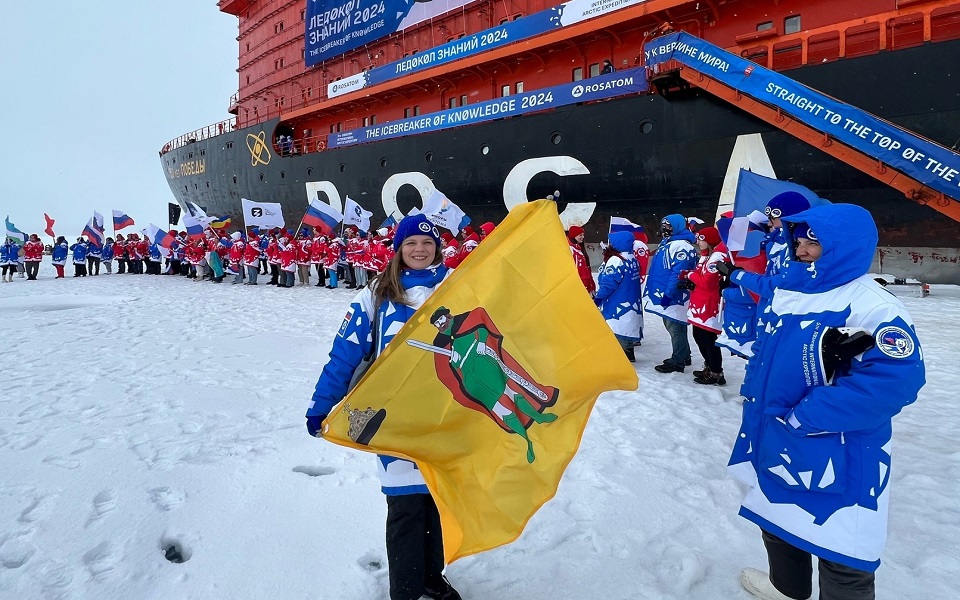 На Северном полюсе развернули флаг Рязанской области. Фотографию на фоне ледокола показала в соцсетях участница проекта «Ледокол знаний» Валерия Тишкина.