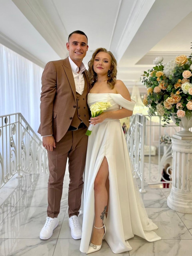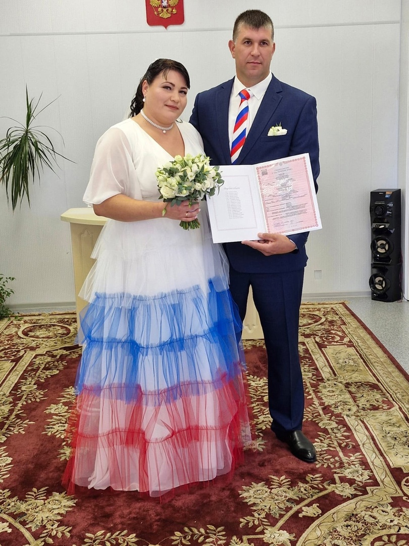Из ярких свадебных образов сентября отметим молодоженов, которые выбрали креативные наряды в цветах российского триколора.