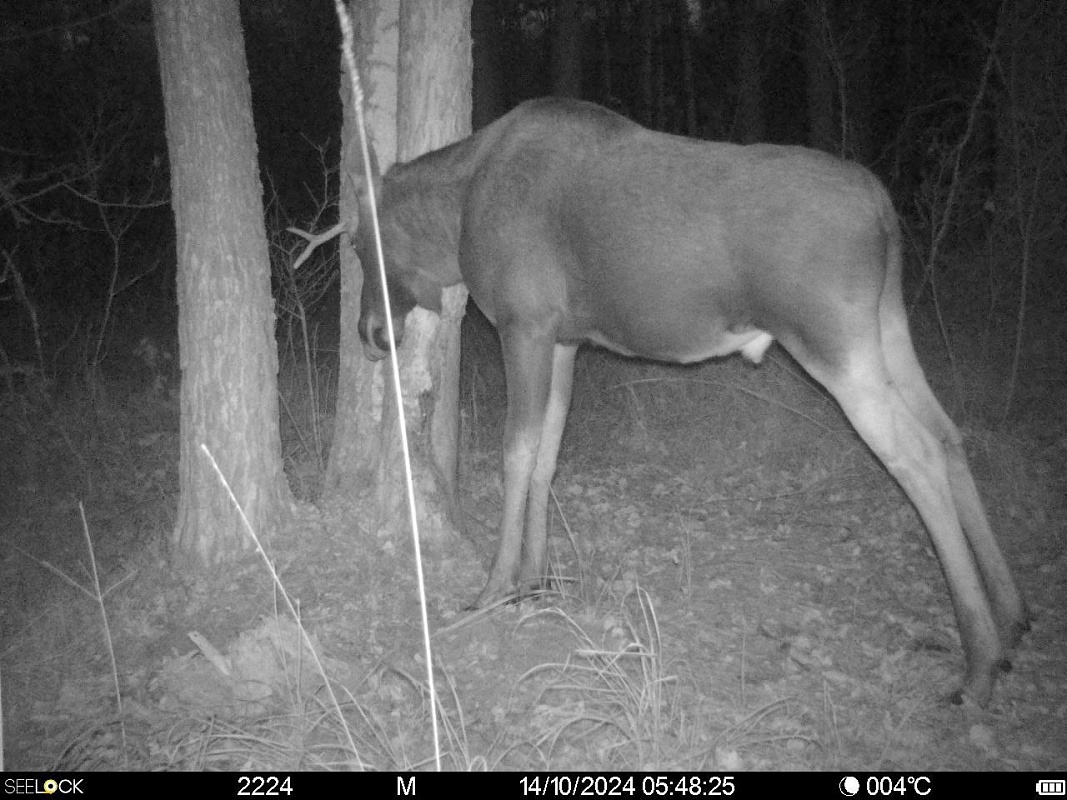 Видимо, репутация этого конкретного ствола как лучшего места что-то почесать дошла и до лосей – молодой лось попробовал почесать о дерево рога. Вскоре лосю предстоит с ними расстаться. Специалисты отметили, что солидные опытные лоси в годах прощаются с рогами в ноябре – у них они впечатляющие, и после гона только мешают. Лосиная молодежь, у которой это украшение скромнее, бегает с рогами подольше, порой до середины зимы.