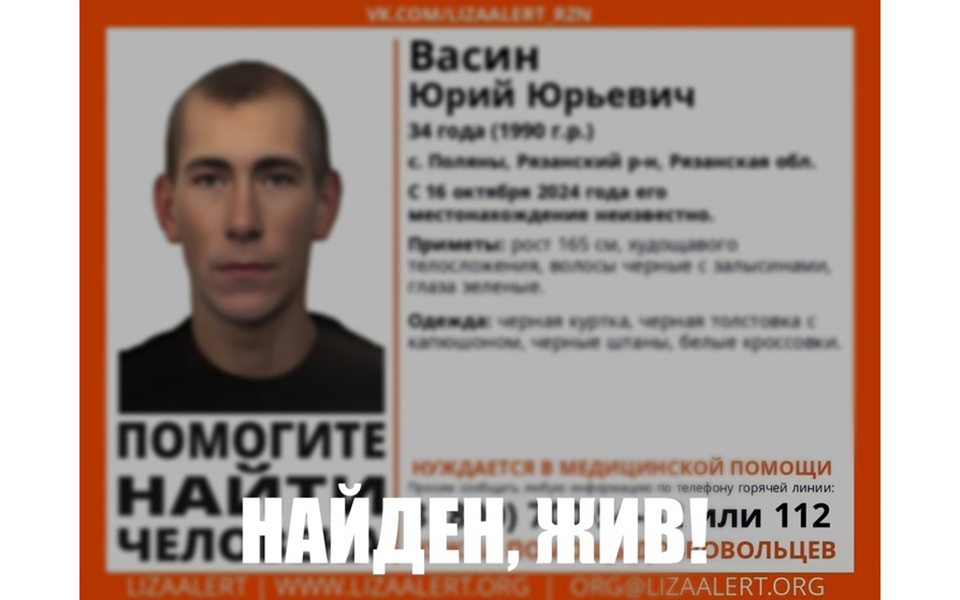 В Рязанском районе нашли пропавшего 34-летнего Юрия Васина. Об этом сообщает ПСО «ЛизаАлерт» Рязанской области.