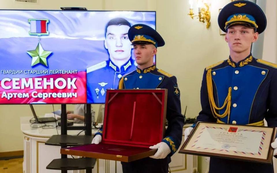 Родственники выпускника Рязанского десантного училища, старшего лейтенанта Артема Семенка в торжественной обстановке получили его награду – медаль «Золотая звезда».