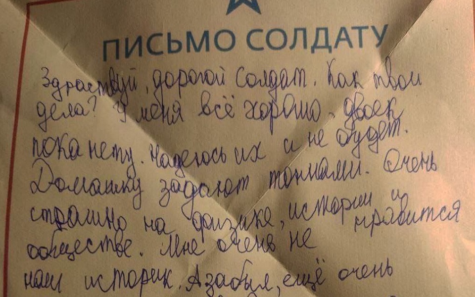 Автор письма - из Рязанской области. Он решил рассказать фронтовику, которому в руки попадет письмо, о своих школьных буднях. Жизнь ученика нелегка: "Домашку задают тоннами. Очень страшно на физике, истории и обществе".