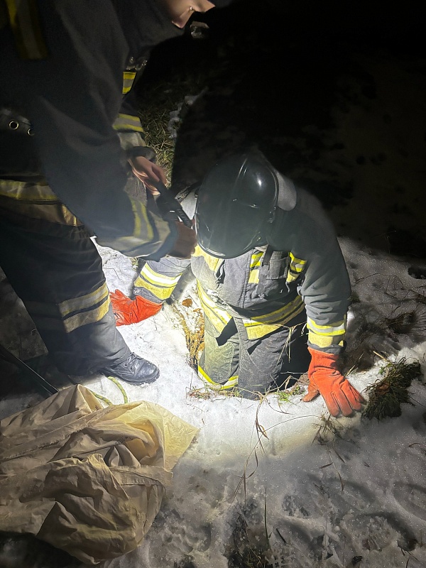К спасателям обратилась местная жительница: она рассказала, что на территории завода собака провалилась в вырытую траншею и не может выбраться. Длительное время у дыры дежурила мать щенка, пыталась вызволить сама и жалобно скулила.