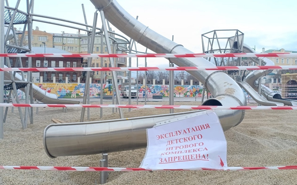Сейчас вокруг площадки с горками и игровым комплексом натянута сигнальная ленточка. Но внимание родителей к безопасности их детей лишним не будет - играть здесь пока нельзя.