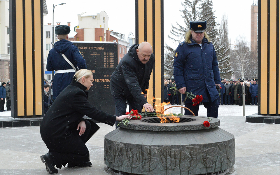 Память павших почтили минутой молчания и троекратным ружейным салютом. К вечному огню и плитам с именами погибших возложили живые цветы.