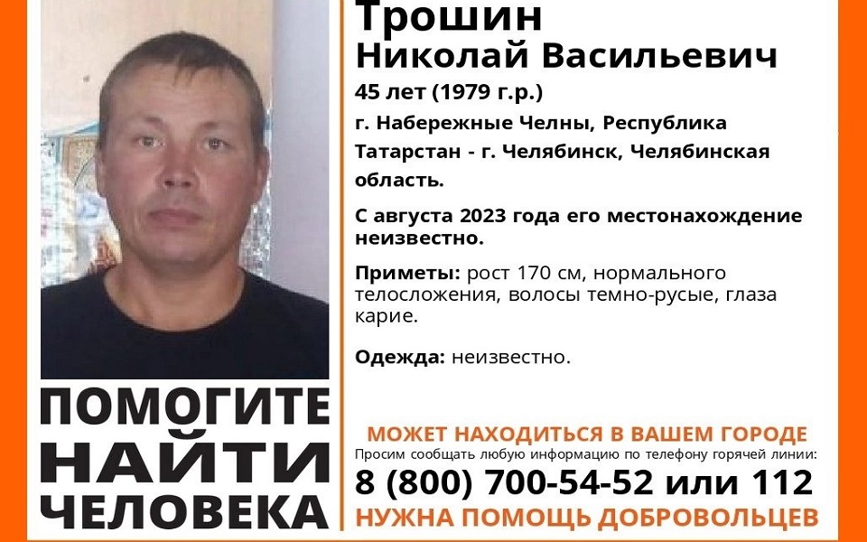 Трошину Николаю Васильевичу 44 года. В качестве места пропажи указано два города: Набережные Челны в Татарстане или Челябинск.