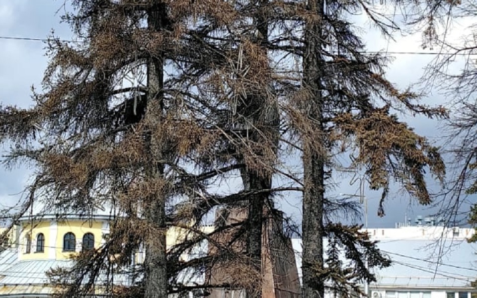 Речь идет о деревьях, растущих рядом с памятников Ленину на площади его имени. Многие горожане уже обращали внимание на то, что хвоя на еловых лапах пожелтела, и деревья с правой стороны монумента выглядят не слишком презентабельно.