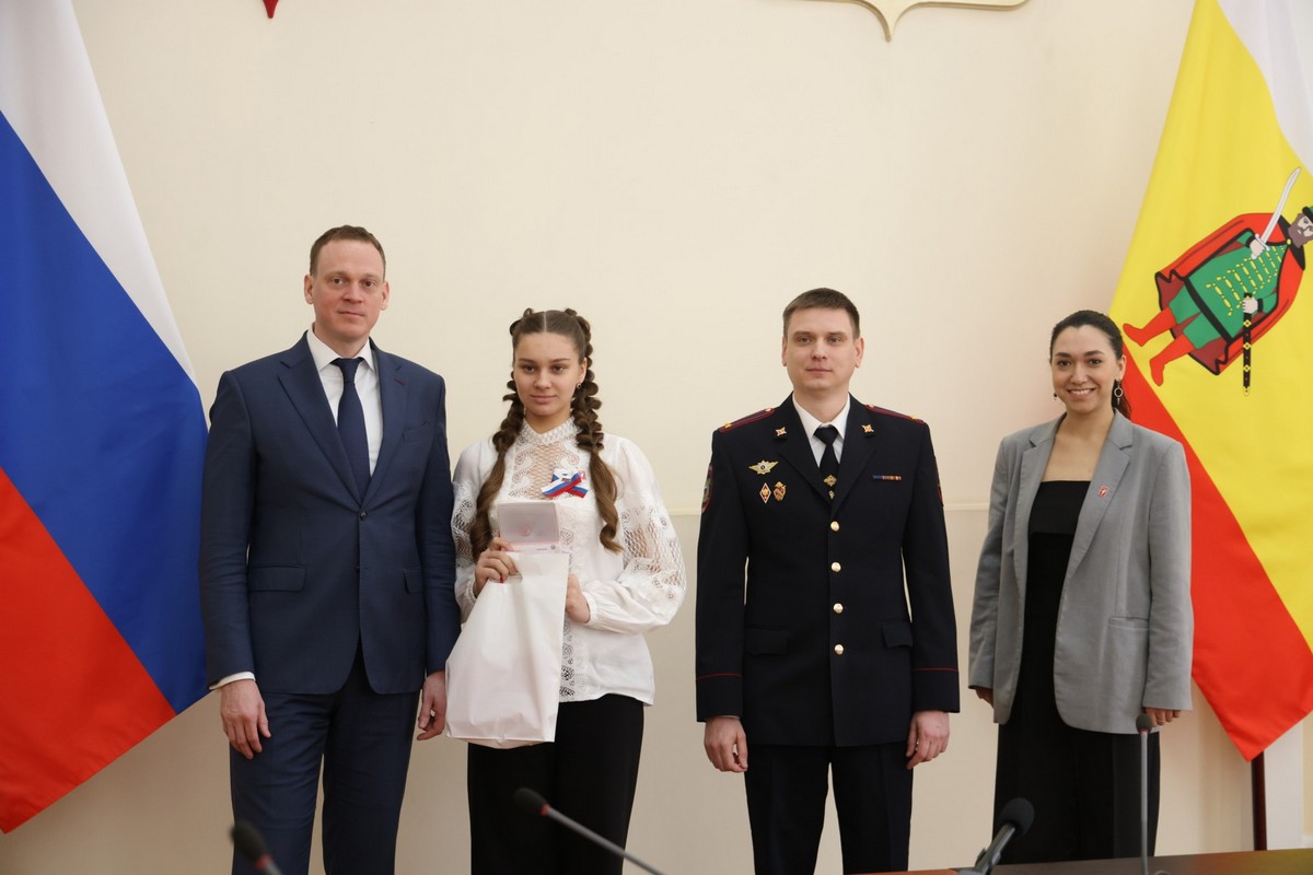 В Правительстве Рязанской области сегодня, 11 апреля, прошла церемония вручения первых паспортов. Документы школьникам вручал губернатор Рязанской области Павел Малков.