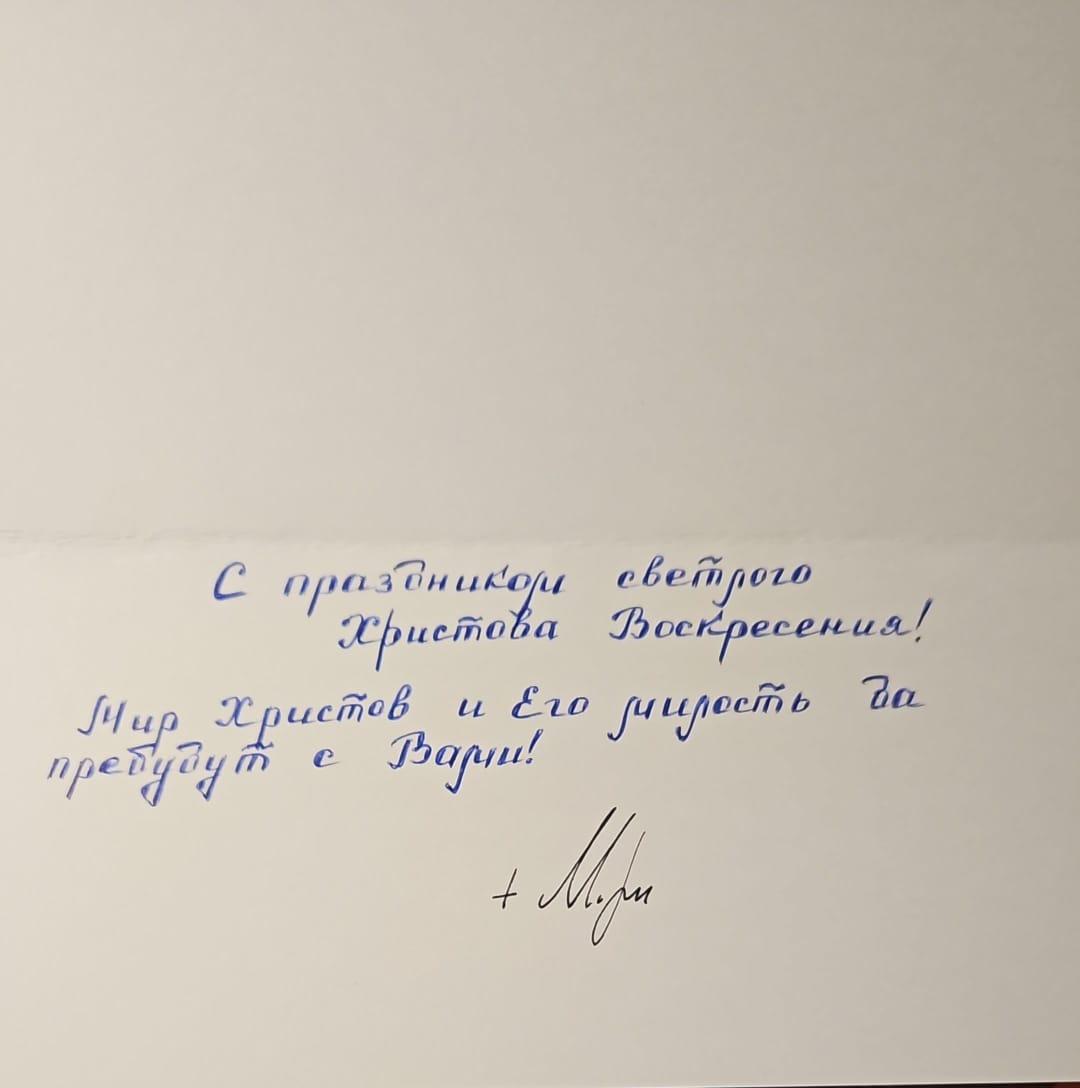 На обороте - слова поддержки: "Мир Христов да Его Милость да пребудут с Вами!", "Победитель смерти открыл нам двери Небесного Царства!", "Мы празднуем умерщвление смерти, разрушение ада, начала другой - Вечной Жизни!".