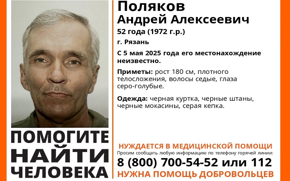 С 5 мая неизвестно местонахождение 52-летнего Андрея Алексеевича Полякова. Мужчине требуется помощь врачей, поэтому важно найти его быстро.