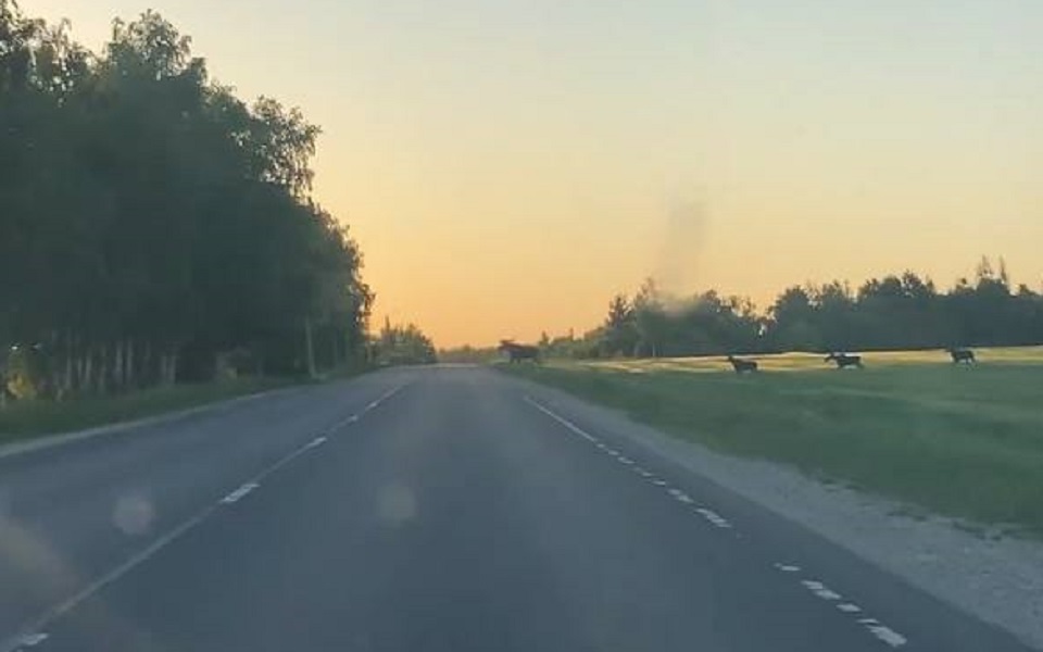 Лоси перебежали дорогу и скрылись в полях. Кадры, судя по свету, сделаны вскоре после восхода солнца. Животные наиболее склонны к прогулкам именно в это время - с заката и до утра.