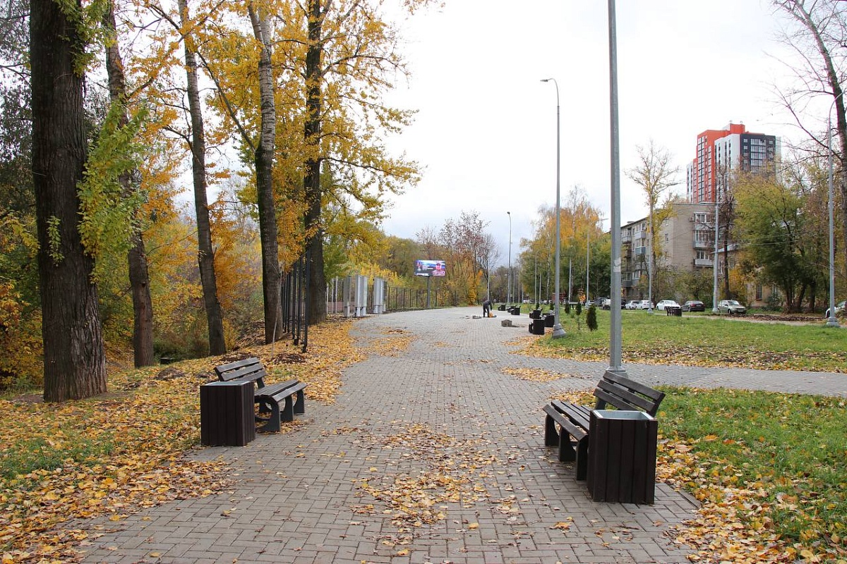 Благоустройство началось в августе. Подрядчик установил новые лавочки, урны, шесть информационных стендов, высадил саженцы деревьев, установил ограждения у ручья. Сейчас работа близится к завершению — проводится укладка тротуара, вход украсят пилоном с наименованием сквера.