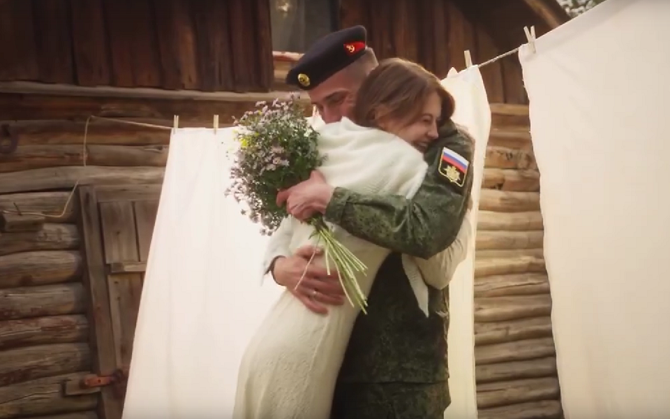 Сюжет видео - возвращение домой фронтовика. Он едет в родные места, встречается с женой, обнимает детей, видится с родителями.
