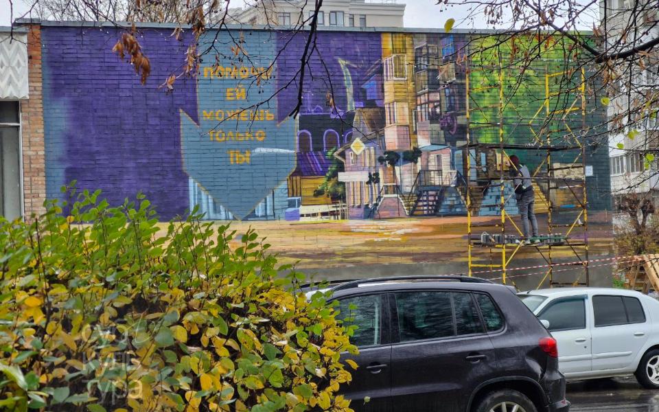 Мурал с надписью «Помочь ей можешь только ты» рисует Вячеслав Прошин. Готовый рисунок можно будет увидеть на стене дома № 112 на улице Есенина.