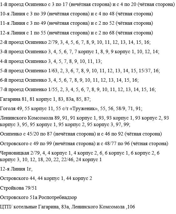 Холодной воды не будет с 9:30 до 17:00 на трёх улицах: Верхняя в домах №№ 1, 2, 6, 7, 8, 9, 10, 11, 13, 15; Новосёлов в домах №№ 1/7, 3; Тимуровцев в домах №№ 1, 2, 3, 5, 5 корпус 1, 5 корпус 5, 6, 6 корпус 1.