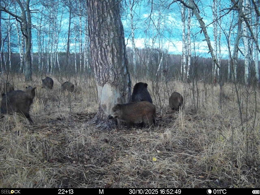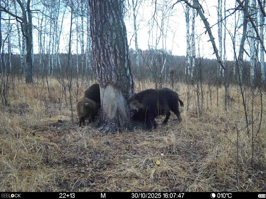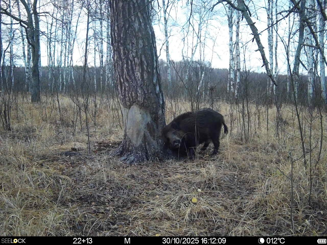 Кабаны продолжают приходить к знаменитой в их кругах чесальной сосне - она дает возможность не только почесаться о грубую кору дерева, но и оставить на стволе свой запах. С помощью таких меток кабаны общаются.