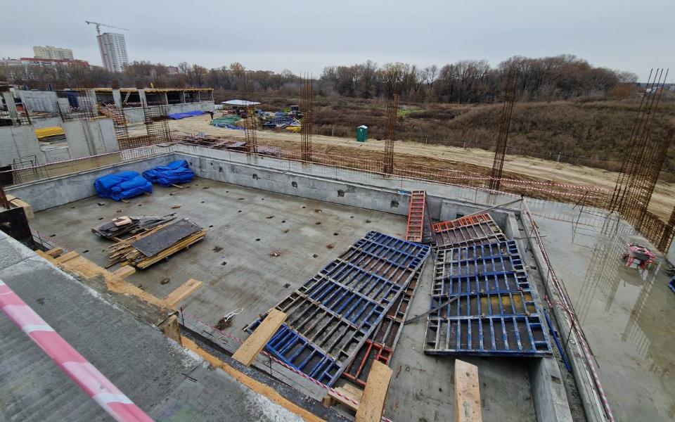 Сейчас на объекте начали возводить конструкции для второго этажа. Уже завершено устройство бетонной чаши бассейна.