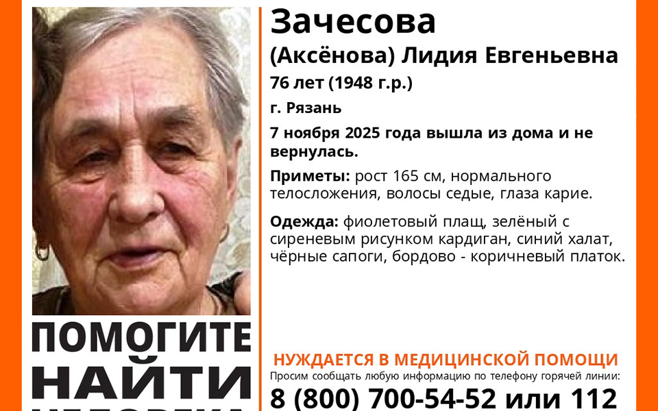 В Рязани разыскивают 76-летнюю Лидию Зачесову. Пенсионерка вышла из дома 7 ноября и до сих пор не вернулась.