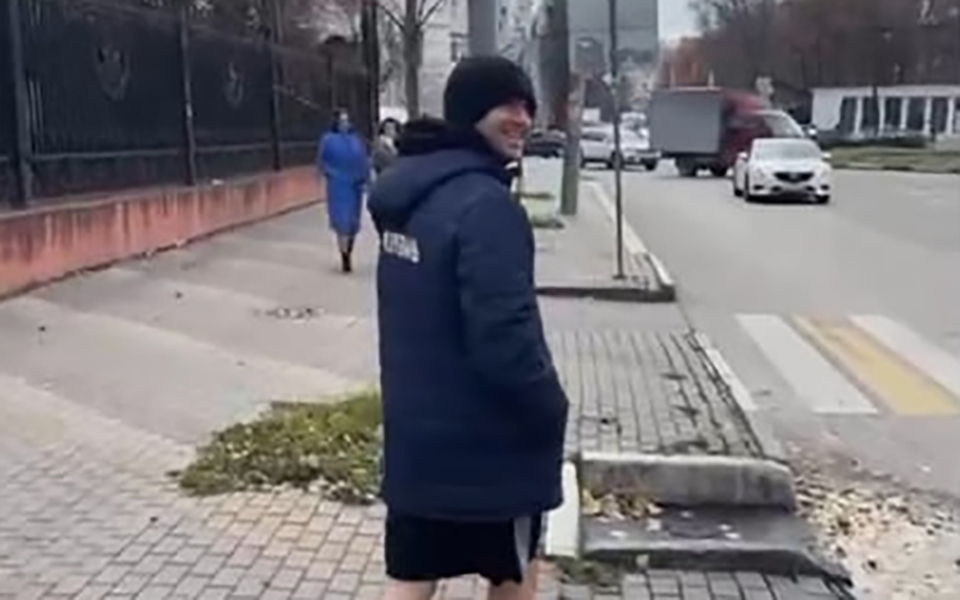 На кадрах видно, что Кержаков, ныне работающий в тренерском штабе сборной, выбрал для поездки на стадион тёмную куртку с эмблемой рязанского футбольного клуба.