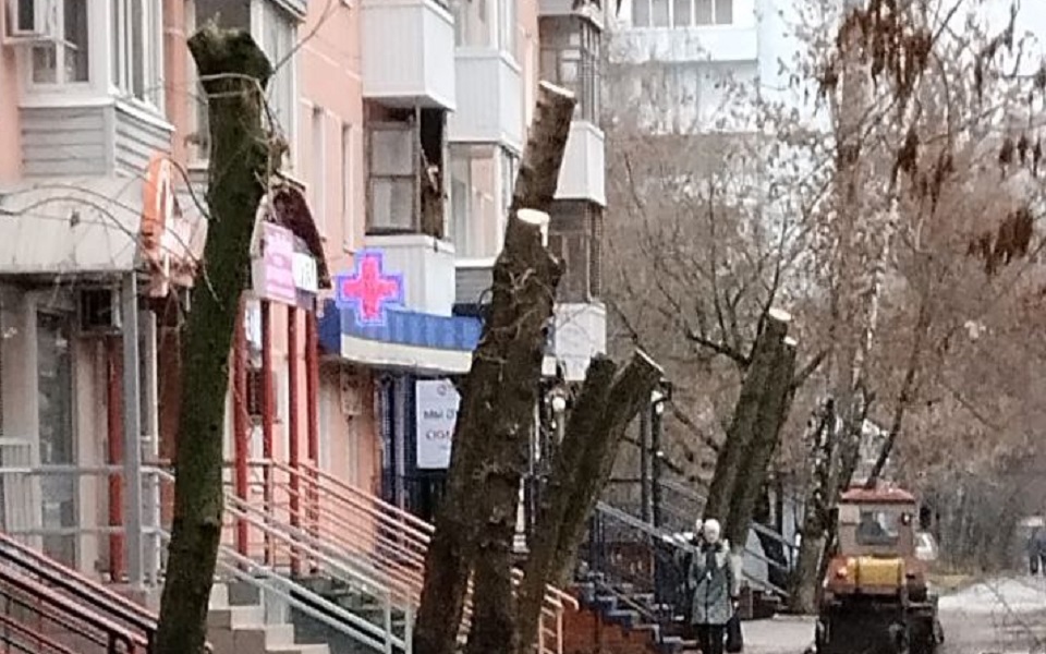 Сообщается, что снимок сделан в микрорайоне Канищево, на Интернациональной улице. "Спилили деревья, оставив стволы высотой 5-7 метров", - отмечает автор фото.