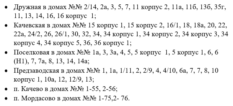 Ресурса не будет до 18:00 по следующим адресам: 3-й Мопровский переулок в домах №№ 2, 4, 4 корпус 1, 8, 10, 12; улица Весенняя в домах №№ с 1/28 по 11 (нечётная сторона) и с 2 по 12 (чётная сторона), 14; улица Высоковольтная в домах №№ 34/13, 48,50а, 47; улица Чкалова в домах №№ с 5 по 13 ,19,19г,27 (нечётная сторона) и с 20 по 62 (чётная сторона), 9а.
