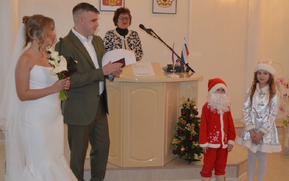 Поскольку приближается Новый год, сегодняшняя церемония прошла не совсем обычно. Молодых поздравила не только Татьяна Никишкина, но и юные Дед Мороз и Снегурочка.