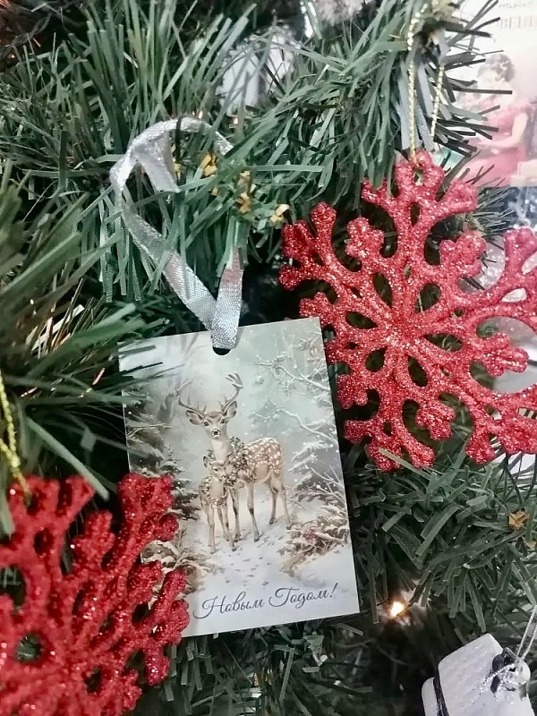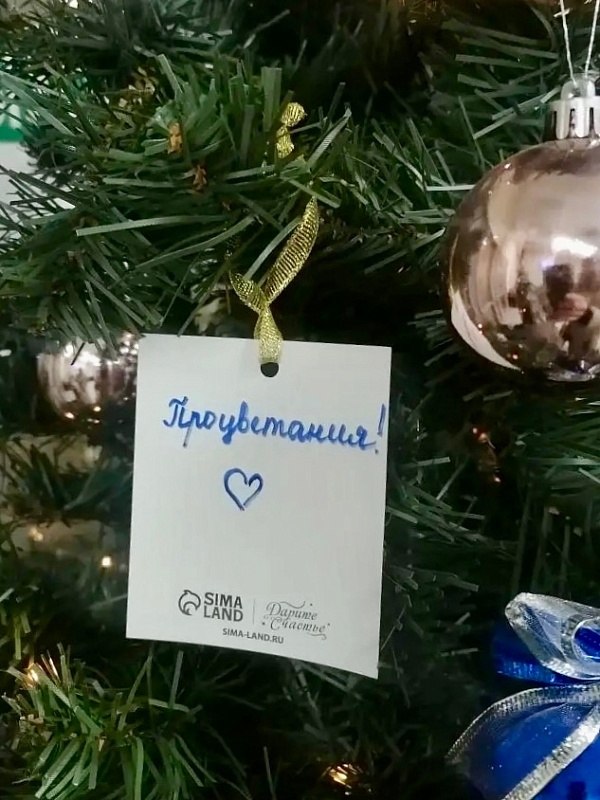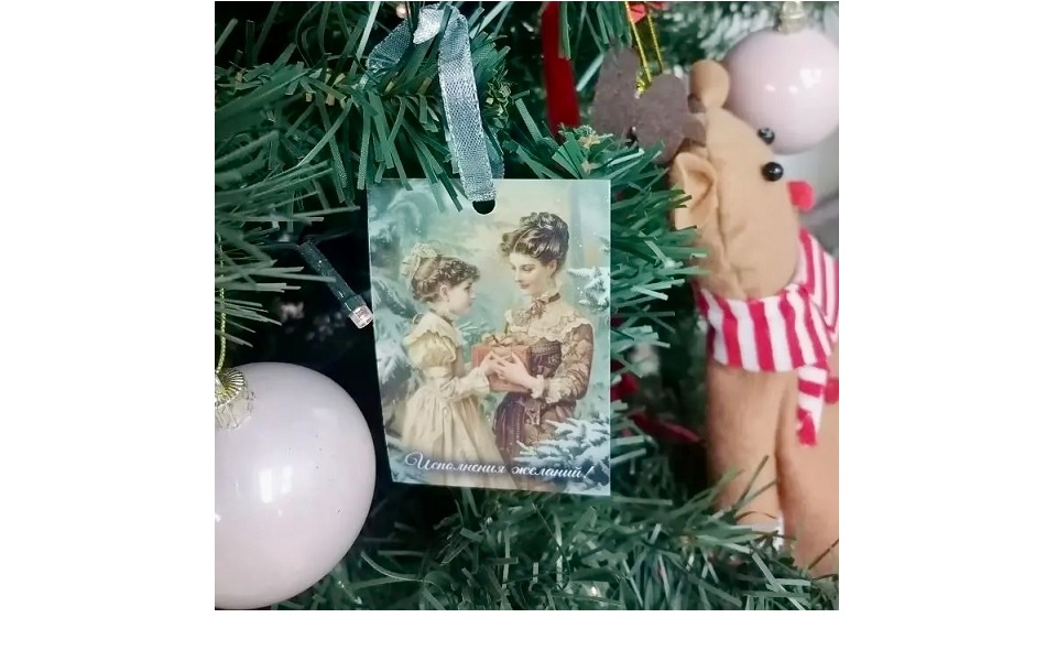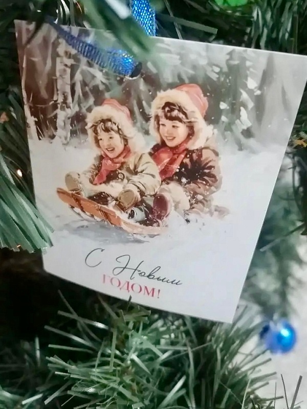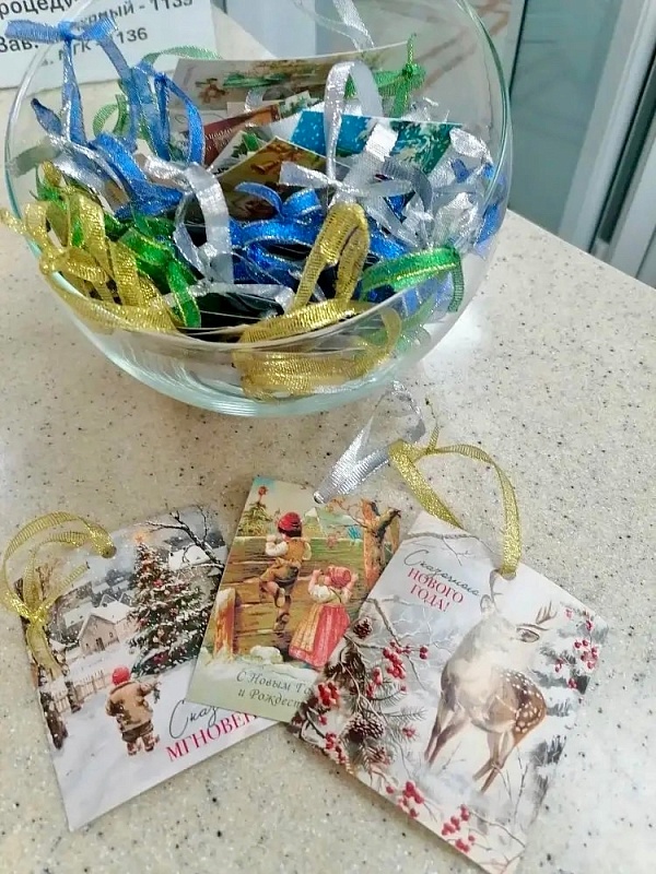 Для этого посетителям и пациентам предлагаются небольшое открытки в ретро-стиле. Их можно не просто повесить на ветки, но и предварительно написать коллективу поздравление с Новым годом.