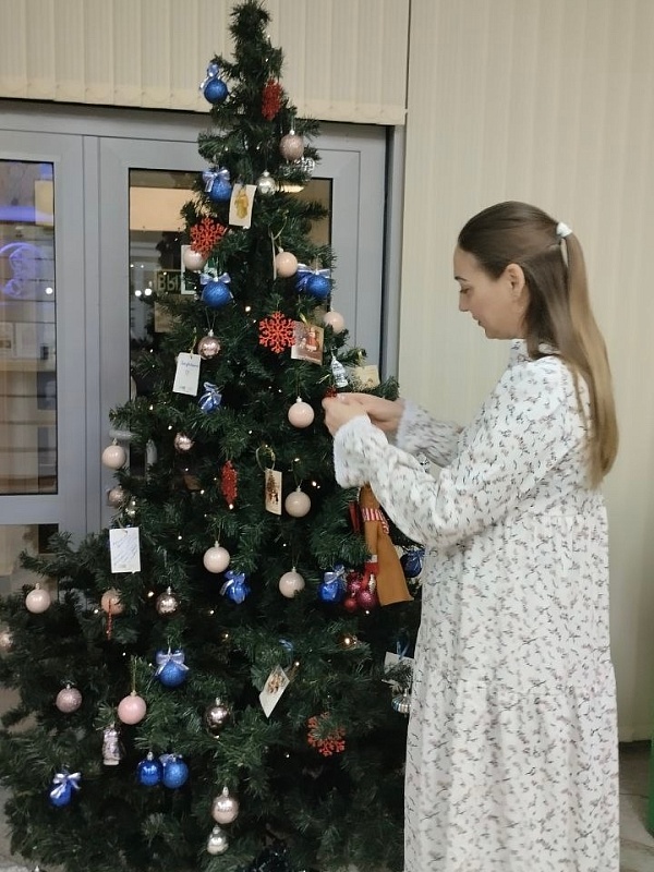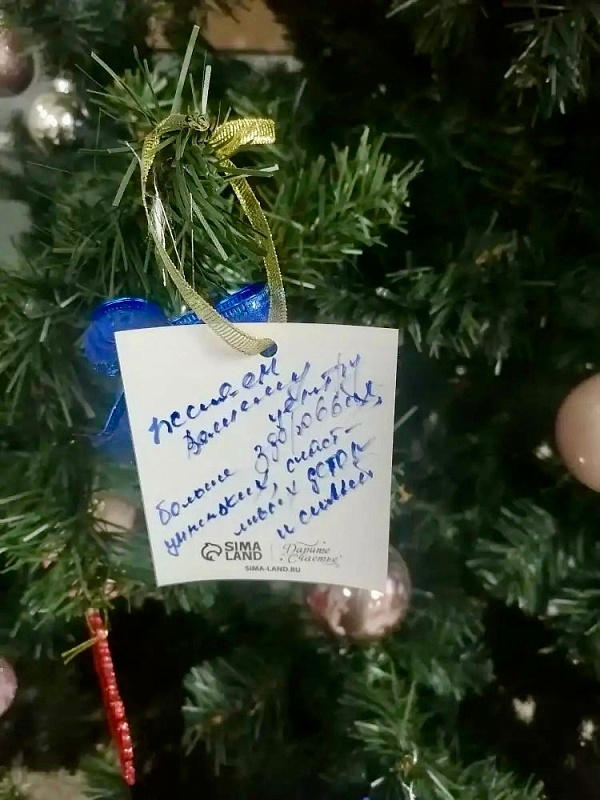 Каждый, кто хочет, может повесить на новогоднее дерево открытку с пожеланием.